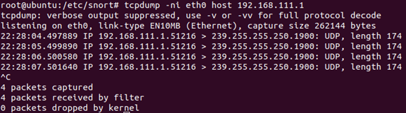 $ Snort -A console -q -u snort -g snort -v /etc/snort/snort.conf