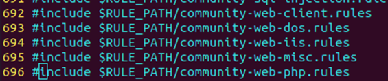 /etc/snort 경로에서 snort.conf를 열어 위에 보이는 룰들, 즉 578~696번째 줄들을 주석처리한다.